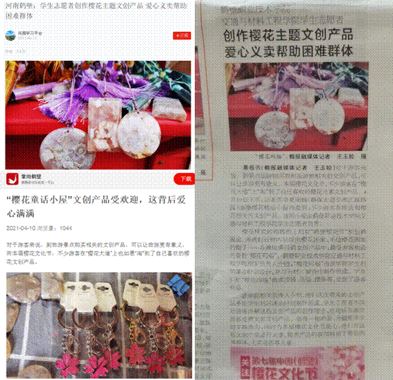樱花样式的钥匙扣是由交材公司员工设计和制作的,上面刻有“鹤壁樱花节”和仙鹤图案,通透的石材内呈现出樱花图案,精美的汽车挂件,手绘樱花图案的帽子...在琳琅满目的文创产品中,最受游客欢迎的要数“樱花玛瑙”。交通与材料工程公司相关负责人介绍,“樱花玛瑙”由物流管理专业的员工利用课余时间设计、并与石材厂家合作制作而成的。把“樱花玛瑙”做成项链、吊坠、摆件等,受到了游客的普遍欢迎,对员工而言也是一项非常有意义的社会实践活动。