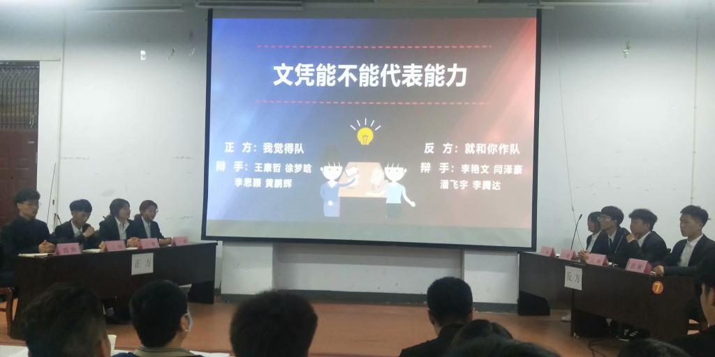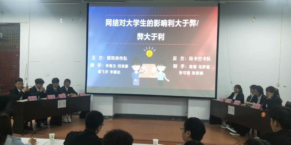 辩论赛第一场,“就和你作”队和“我觉得”队围绕“文凭能不能代表能力”这一辩题,进行了一系列充满激情的辩论,最终由“就和你作”队赢得了第一场辩论的胜利。决赛由获胜的“就和你作”队和从复赛突出重围的“玛卡巴卡”队进行最后的冠军角逐。他们的辩题是“网络对于老员工的影响利大于弊/弊大于利”,双方围绕这一辩题进行了开篇立论、攻辩、自由辩论、总结陈词等几个阶段的激烈辩论。唇枪舌战中,双方辩手口若悬河、妙语连珠,精彩表现赢得现场师生阵阵掌声。最后,“玛卡巴卡”队赢得此次辩论赛的冠军。