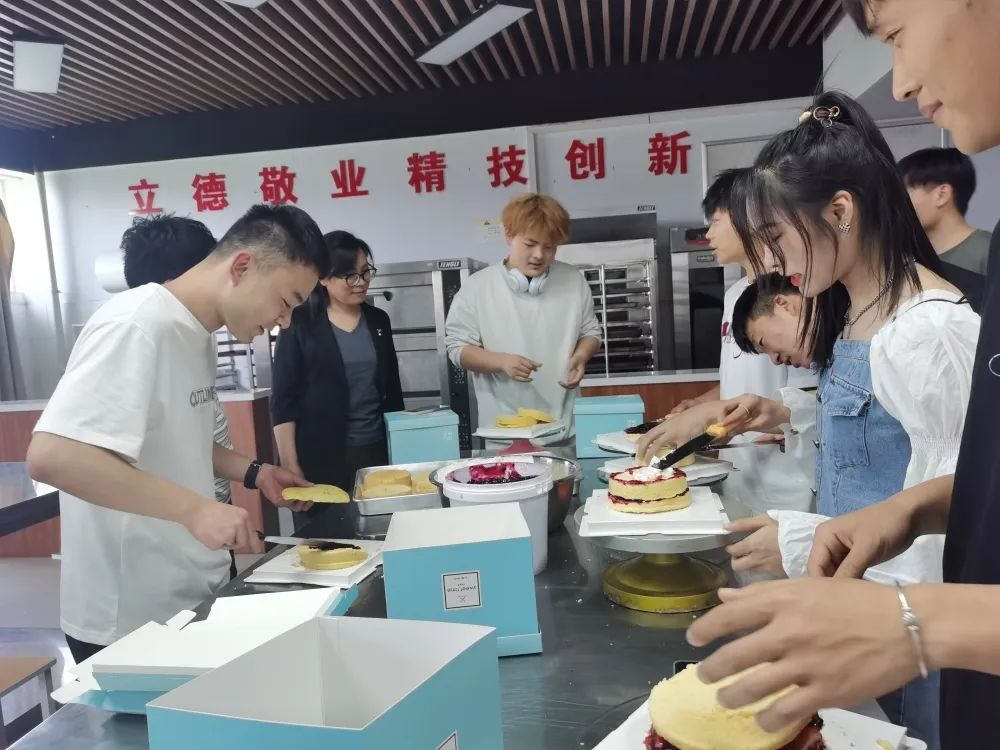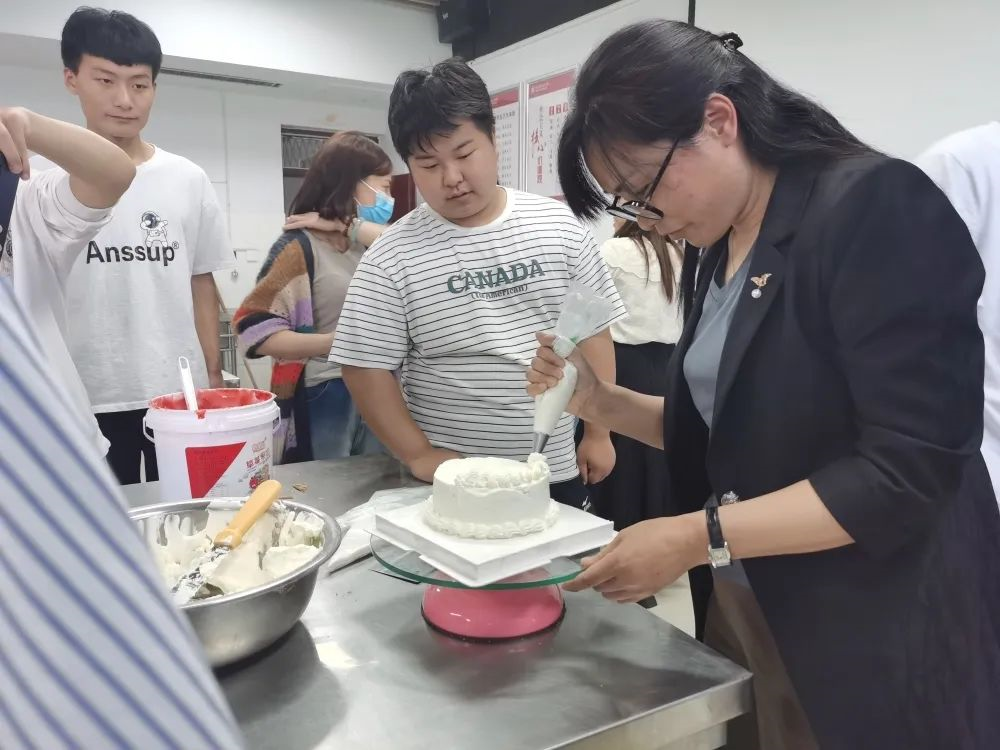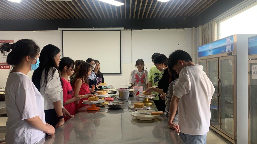 随后进入实践环节,大家热情高涨,气氛热烈,欢快而温馨。在专业老师的指导下,师生一起动手,通力配合,空气中弥漫着奶油的香甜、水果的清香和师生们的欢声笑语。通过一番制作,一个个鲜美可口、造型独特的水果奶油蛋糕出炉了!