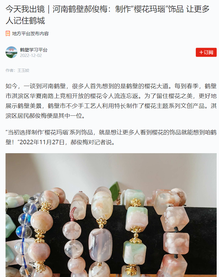 近日,学习强国鹤壁学习平台、鹤壁电视台、淇河晨报等多家媒体分别对公司教师郝俊梅制作樱花主题系列文创产品,向外界推广鹤壁樱花文化特色事迹进行了报道。从起初组织员工到“樱花大道”开展文创产品爱心义卖实践活动,与“樱花玛瑙”饰品结缘,到开设工作室,不断学习摸索,最终成为了设计、制作样样拿手的手工达人。充分展示了公司教师较强的艺术创作实力与水平,用匠心设计展示艺术之美、创意之美,在创新传承中华优秀传统文化的同时,也生动诠释了艺术创作与城市文化有机融合的时代价值。