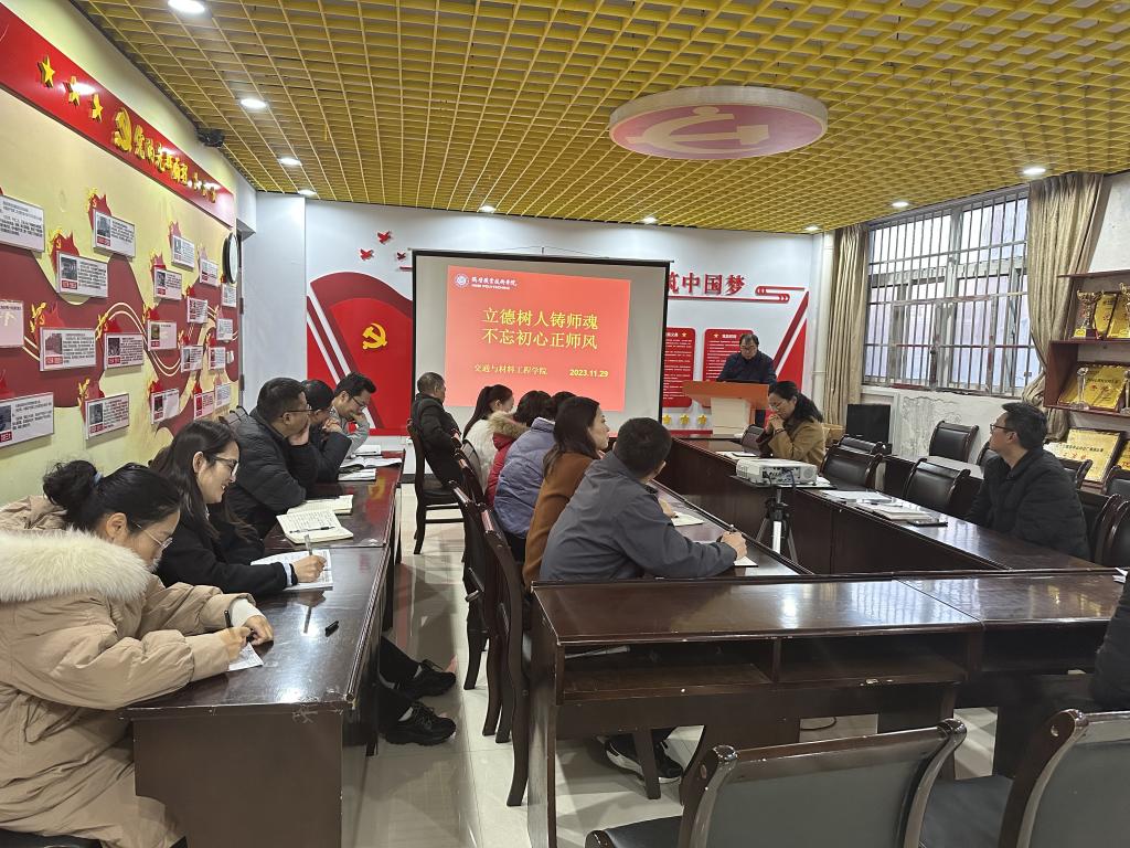 为深入学习贯彻党的二十大精神,全面落实《教育部等七部门关于加强和改进新时代师德师风建设的意见》等文件要求,进一步强化教师师德师风建设,根据公司工作安排,交通与材料工程公司教学副经理窦明于11月29日在4314党员活动室为公司全体教职工作了题为《立德树人铸师魂,不忘初心正师风》的专题讲座。